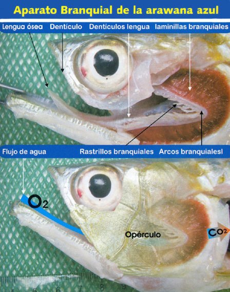 El aparato branquial de la arawana azul está constituido por arcos branquiales a cada costado de la parte posterior de la cabeza. En la parte anterior de los arcos se encuentran estructuras óseas denominadas rastrillos branquiales, involucradas en el proceso de ingestión del alimento. En el costado posterior de cada arco se fijan los filamentos branquiales que, junto al medio acuoso, constituyen el soporte de las laminillas branquiales.