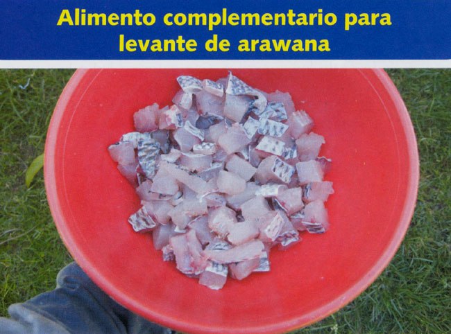 Para garantizar buenos resultados en el proceso de adaptación y levante, se debe ofrecer alimento externo a las arawanas, lo cual mejora la velocidad de crecimiento y la supervivencia. Teniendo en cuenta la baja adaptabilidad al consumo de alimentos concentrados, se debe recurrir al suministro de pescado fresco en trozos adecuados al tamaño de la boca de los ejemplares de arawana azul.