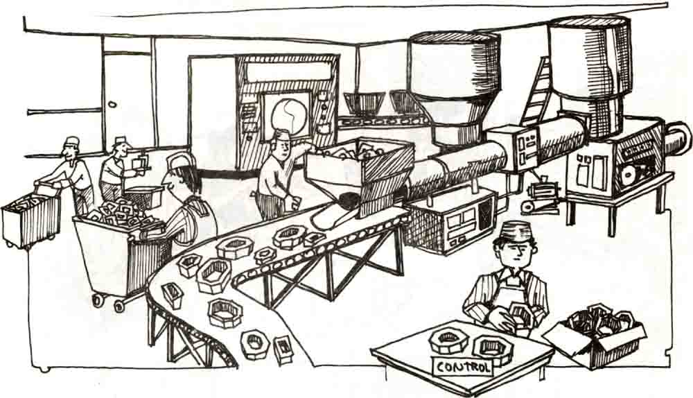 Posteriormente con la introducción de máquinas, el proceso de elaboración de un producto se subdivide en una mayor cantidad de procesos elementales y las personas se dedican al control de una o varias de estas fases especializándose más el trabajo.