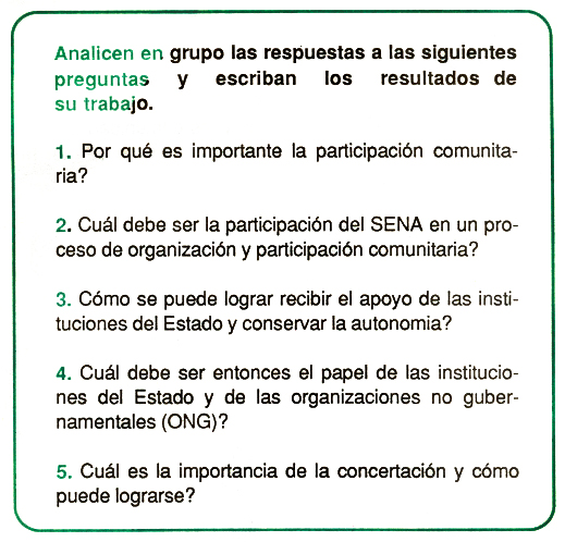 Como uno de los principios que fundamentan esta participación es la concertación de la comunidad con las instituciones del Estado y los organismos no gubernamentales (ONG), es muy importante que ustedes conozcan la metodología que les proponemos en la presente cartilla, para que la analicen en grupo y puedanacordar con los funcionarios de las diferentes instituciones los compromisos de cada una de ellas y hacer la programación de actividades que garanticen el éxito de los proyecto que decidan emprender.