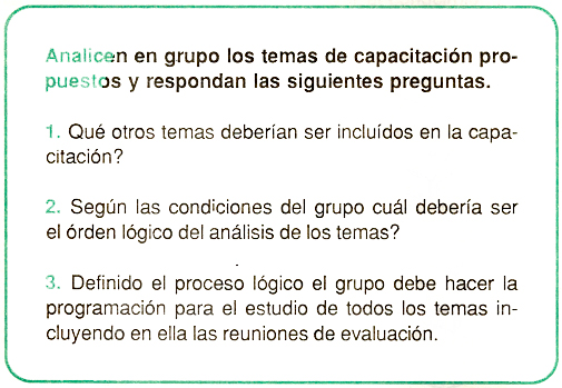 Por esta razón, la programación de la capacitación se elabora teniendo en cuenta el proceso lógico que debe seguir la comu-nidad para organizarse, diagnosticar su situación, planear y ejecutar sus proyectos de desarrollo.