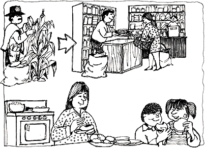 Tendremos que recordar entonces el trabajo del campesino, del experto agrícola, del técnico de la fábrica de abonos, del transportador, del industrial y del comerciante. Notemos que se requiere una cadena de personas, que con su trabajo, hacen posible que otros puedan satisfacer la necesidad de obtener el alimento.