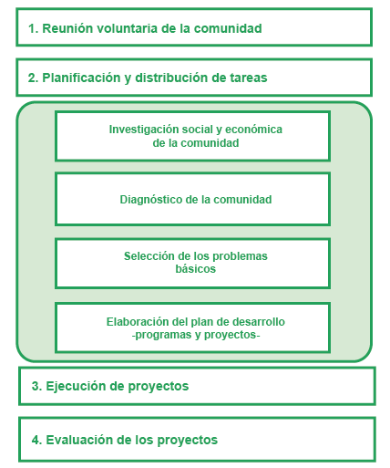 El proceso de organización comienza cuando los miembros de una comunidad interesados en solucionar los problemas que tienen, se reúnen voluntariamente y deciden participar activamente en la búsqueda de soluciones.