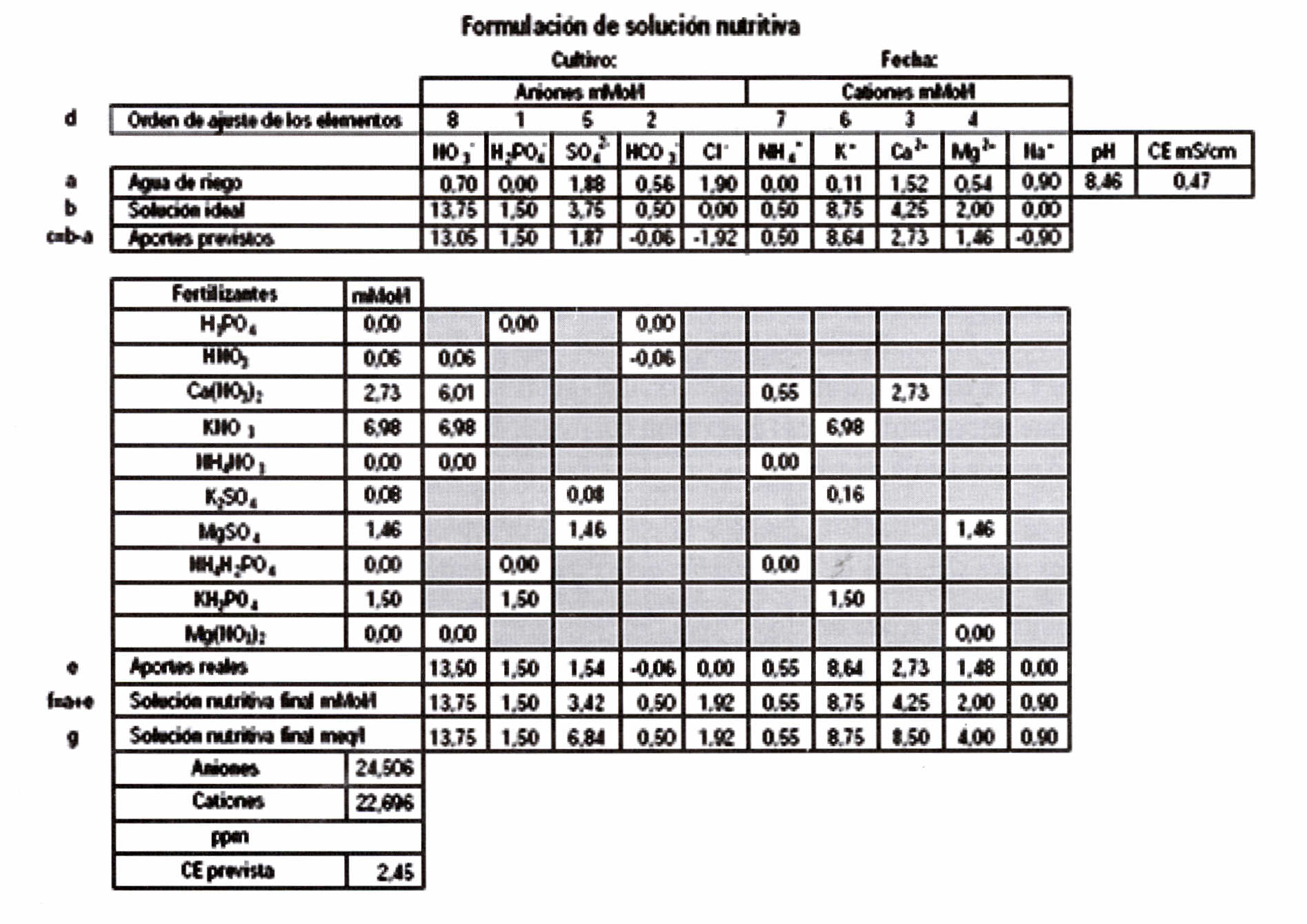 Casas, A. 1999.Formulación de Soluciones Nutritivas. Parámetros de ajuste. Curso superior Cultivos sin Suelo II. CoEd. Junta Andalucía, FIAP A Y Caja Rural Almería.