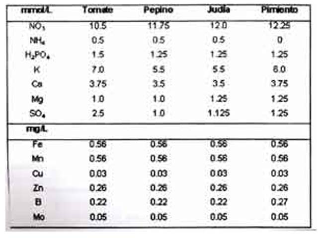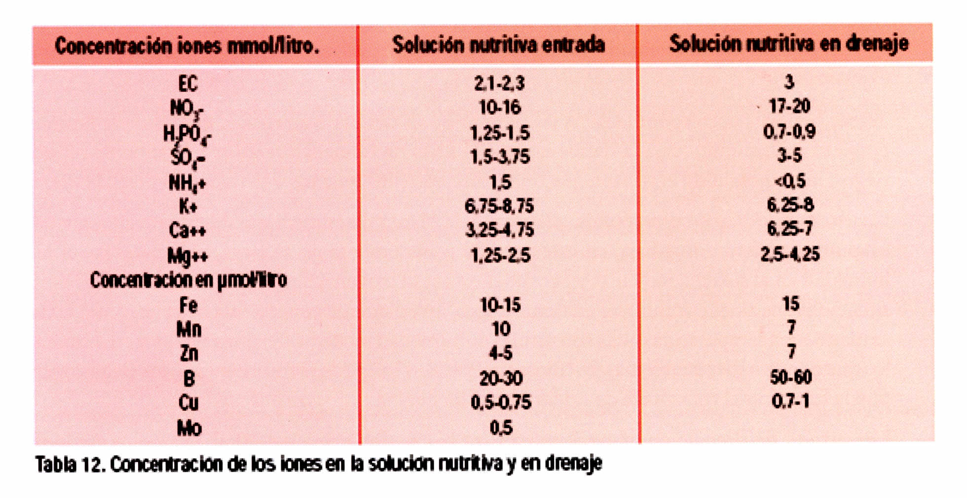 Las soluciones nutritivas, se van a modificar en función de los resultados de los análisis del agua de drenaje. En la siguiente tabla, se indican unos rangos de concentración de iones de la solución nutritiva con la que podemos regar y los niveles con los que nos podríamos encontrar en la solución del drenaje en los principales cultivos hortícolas: