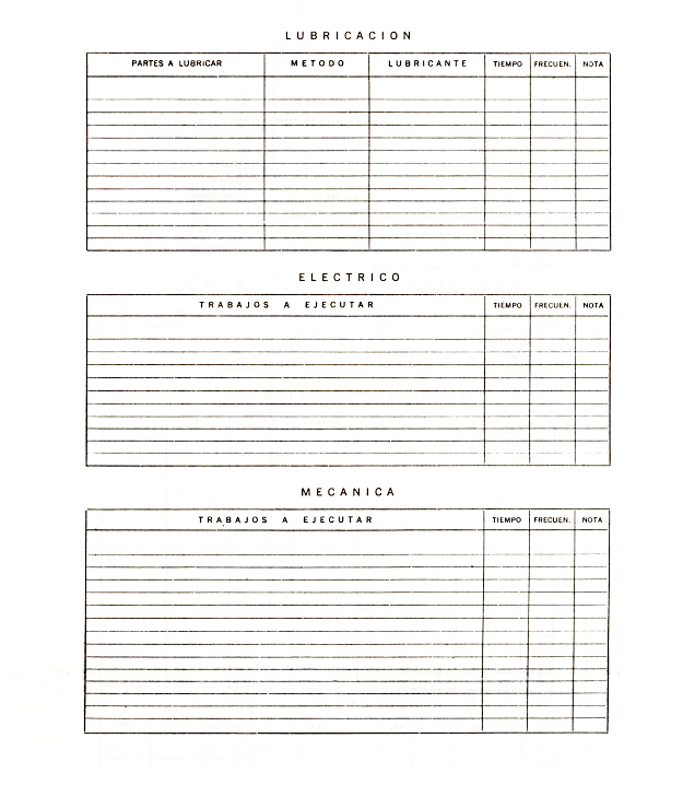 3. COSTOS EN EL DEPARTAMENTO DE MANTENIMIENTO 3.1 Clases de costos 3.1.1 Costos Directos de Mantenimiento 3.1.2 Costo de Parada de Equipo 3.2 Niveles de Mantenimiento 3.3 Elaboración de Tarifas 3.3.1 Tarifas para Mano de Obra de Mantenimiento 3.3.2 Tarifas para las Máquinas de Producción 3.4 Asignación de Códigos Contables 3.5 Control en los gastos de Mantenimiento 4 PROGRAMACION 5 MANTENIMIENTO PREVENTIVO 5.1 Definición y Programación 5.2 Conceptos importantes que se deben tener en cuenta durante la implantación del Mantenimiento Preventivo 5.3 Ventajas del Mantenimiento Preventivo 5.4 Requisitos indispensables para implantar un programa de Mantenimiento Preventivo 6. MANTENIMIENTO PREVENTIVO POR SISTEMA L.E.M 6.1 Tarjeta maestra 6.2 Codificación y estandarización de la Lubricación 7 MANUAL DE MANTENIMIENTO PREVENTIVO 8 CONTROL DEL MANTENIMIENTO PREVENTIVO 8.1 Primer control. 8.2 Segundo control. 8.3 Tercer control.