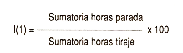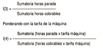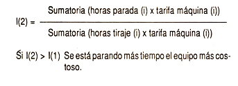mantenimiento preventivo, correctivo, programado y limpieza; además, horas ti raje como las horas en las cuales el equipo está emitiendo unidades de producción.Si quiere ponderarse el tiempo de parada con la tarija de la máquina, con el fin de saber si es el equipo más costoso el que se para más horas o viceversa, se puede proceder así: