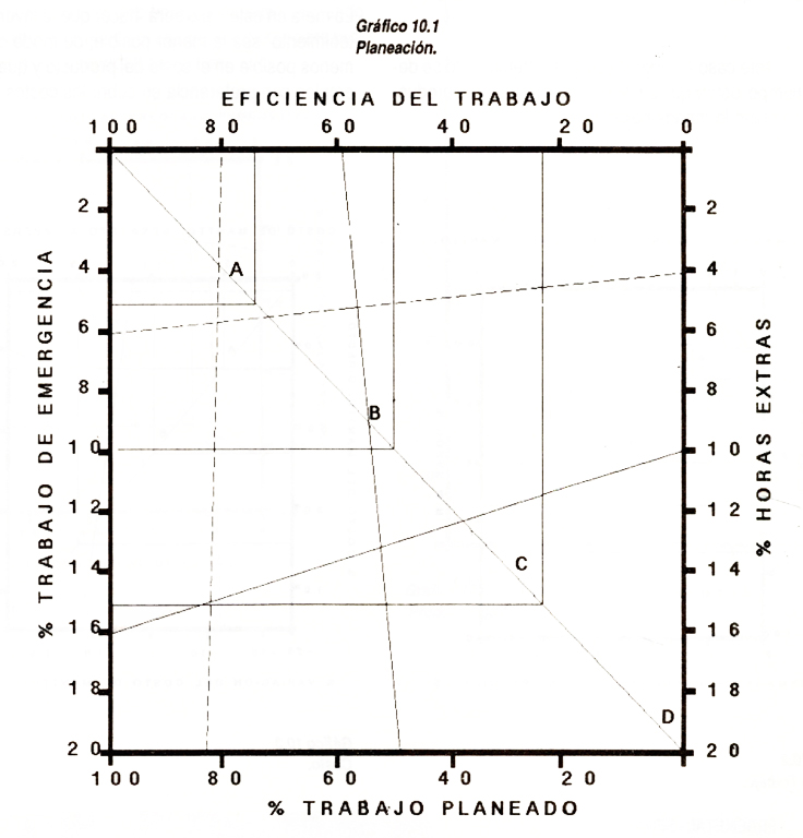 Después se graficaron los índices situando en cada uno de ellos los cuatro que conforman el grupo y el área total se divide en cuatro sectores que indican:a. Buen desempeño.b. Superior al promedio.c. Inferior al promedio.d. Desempeño deficiente.La mejor forma de entender el uso de este método es revisar los gráficos.10.2.1 PlaneaciónLos índices que conforman este grupo son: - Eficiencia del trabajo.- Porcentaje de trabajo de emergencia.- Porcentaje de horas extras.- Porcentaje de trabajo planeado.En este caso la meta será: hacer el máximo de trabajo planeado en forma eficiente con el mínimo de horas extras y logrando que el trabajo de emergencia se reduzca al mínimo.Las líneas sólidas de la siguiente figura representan la situación actual de una empresa y las punteadas la meta propuesta.
