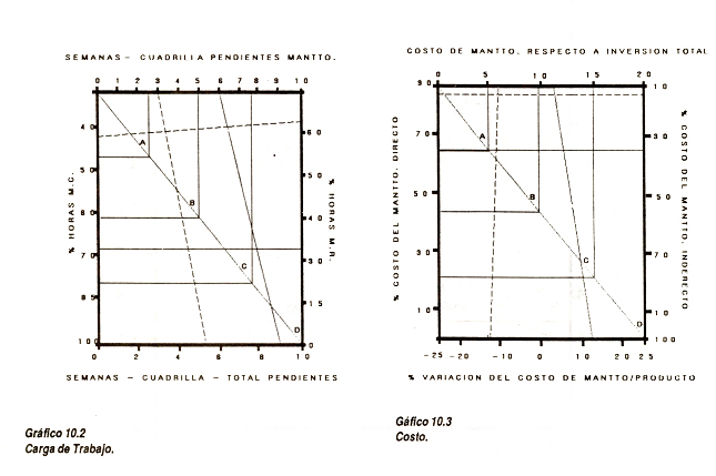 10.2.2 Carga de trabajoLos índices que conforman este grupo son:- Retraso del trabajo de mantenimiento, medidos en semana• cuadrilla.- Retraso total de todas las actividades en semanas.- cuadrilla.- Porcentaje del total de horas - hombre por mes de Mantenimientos preventivo y selectivo.- Porcentaje del total de horas - hombre por mes de mantenimiento correctivo y emergencias. En el caso de los dos últimos índices, será tan malo dedicar muy poco tiempo al mantenimiento como dedicarle demasiado.La meta en este caso es: lograr que al mantenimiento se dedique el tiempo justo y que su desarrollo y las labores productivas se retrasen lo menos posible.