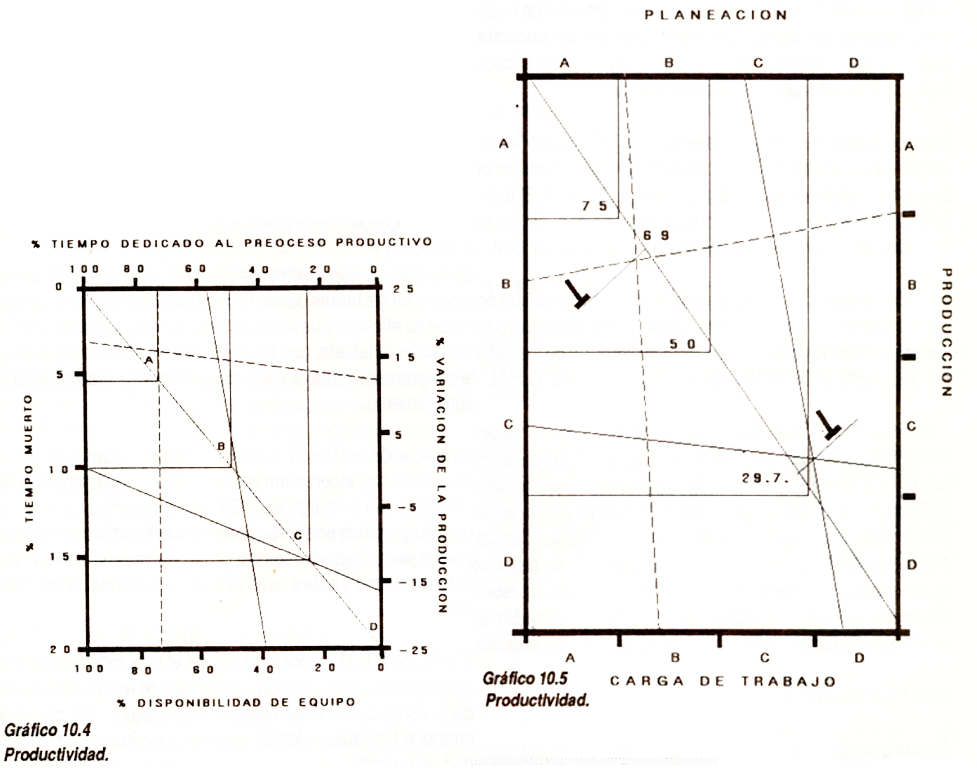 - Porcentaje de aumento o disminución de la producción por horas - hombre de mantenimiento empleadas.- Porcentaje de disponibilidad del equipo respecto al máximo.En este grupo la meta es: dedicar el máximo de tiempo al proceso productivo, reduciendo los tiempos muertos, logrando una menor variación y teniendo el equipo disponible para producir durante la mayor cantidad de tiempo.01.2.5 Gráfica maestraLos resultados de las cuatro gráficas (distancia a escala entre los puntos de intersección y las líneas que limitan las áreas), se pasan a una gráfica maestra, donde aparecen los cuatro grupos de índices mencionados.Uniendo los cuatro lados se obtiene una calificación general de mantenimiento para el período de análisis. El valor de dicha calificación se obtiene trazando una perpendicular del punto de intersección de las líneas hasta la diagonal del cuadrado (de cero a cien).