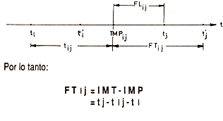 Flotante libre: FL de la actividad es el tiempo que puede demorarse la iniciación de la actividad considerada, sin interferir la iniciación de alguna actividad subsiguiente.FL i j=tj - ti - t ijEl tiempo flotante de interferencia: Fl i- j de la actividad es la diferencia entre el tiempo flotante total F T I J y el tiempo flotante libre F L I j
