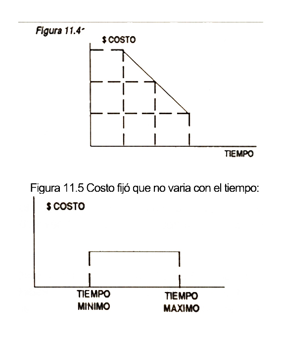 Costo DirectoEl costo directo de una actividad es la suma de los gastos de mano de obra directa, de materiales y de equipos necesarios para efectuarla.Cuando se encarga la realización de una actividad completa a una entidad distinta, por ejemplo a una empresa consultora a un subcontratista de construcción, el costo directo es la cantidad que habrá que pagarse a esa empresa.La relación entre el costo directo y la duración de la actividad puede tomar diversas formas. Frecuentemente se supone que todas las actividades pueden representarse por una recta como la que aparece en la figura 11.4; pero, aunque es esta relación lineal la que corresponde a un alto porcentaje de actividades, de ningún modo puede aplicarse a todas ellas.Figura 11.1 Incremento lineal del costo al decrecer el tiempo: caso de una tarea que puede realizarse con buen rendimiento incrementando los recursos.Otros cuatro tipos corrientes de curvas de costos directos versus tiempo son: