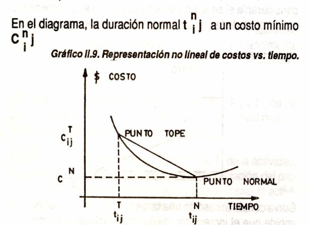 Es inconcebible que la disminución de la duración pueda llegar a cero, aun cuando se utilicen todos los recursos de que se disponga.Por lo tanto, se presenta una duración tope que se denomina duración límite o crítica de la actividad i - j y al costo máximo asociado se le llama costo tope, límite o crítico. El costo tope es el costo directo más elevado de la actividad. Por otra parte, el costo más bajo de la actividad, está relacionado con el punto de la duración normal.