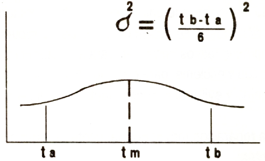 El cual sólo sirve para indicar la duración de cierta actividad con la mayor probabilidad de acertar. Pero en el transcurso de realización de la obra, el tiempo realmente requerido no puede conocerse sino hasta que se ha a terminado la actividad. El grado de incertidumbre o riesgo de no acertar la duración media t i calculada para la actividad, está medido por la varianza de la variable t, la cual puede obtenerse con la formulación:
