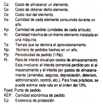 Costos de almacenar (Ca): estos, romo su nombre lo indica, son la Suma de todos los costos asociados ron mantener en el almacén un artículo determinado, a saber:- Interés sobre el capital invertido, el cual puede situarse entre las tasas de interés bancario y el rendimiento esperado si se hiciese una inversión equivalente en otras áreas del negocio.- Aumento de la depreciación, debido a la cantidad extra que se mantiene en existencia.- Aumento de los riesgos de obsolescencia.- Seguros e impuestos.- Costo del espacio, facilidades y servicios.- Costos de mano de obra por manejo del almacén.-Costo del elemento (Ce): este es el rosto real de una pieza y se puede determinar sumando:- Precio de compra.- Costos del flete.- Descuentos.