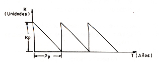 El gráfico K vs. T para existencias de consumo programado e importantes, queda ahora así:De consumo programable: como ya fue determinado, la existencia óptima de esta clase de elementos es igual a la cantidad máxima instalada en un equipo (Ki). Entonces, el punto de pedido se podrá determinar por el punto de quiebre de esta cantidad.Pped = (Ki - 1) + EpDonde Ep = Ki Para existencias importantes, ya que se deben cubrir las posibles necesidades de los equipos, como se mencionó anteriormente.Ep = O Para existencias no importantes.El gráfico K vs. T para existencias de consumo programado e importantes, queda ahora así: