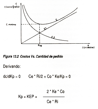 Se puede obtener ahora la cantidad óptima o económica de pedido (KOP ó KEP), bien sea graficando los costos anteriores y encontrando el mínimo del costo total o derivando la ecuación obtenida para c respecto de Kp y encontrando el punto que minimiza C.