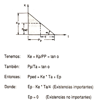 A continuación se describe un modelo matemático que sirve para calcular Pped y Ep teniendo en cuenta los distintos tipos de existencias mencionados.- De consumo continuo: basándose en el gráfico 13.1 de K vs. T , se tiene que:Pped debe ser tal que cuando se llegue a él, exista tiempo suficiente para que el nuevo pedido llegue antes de que K alcance el valor de cero.