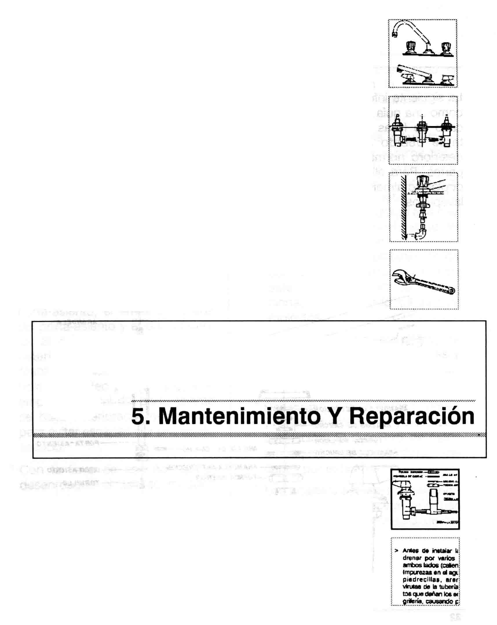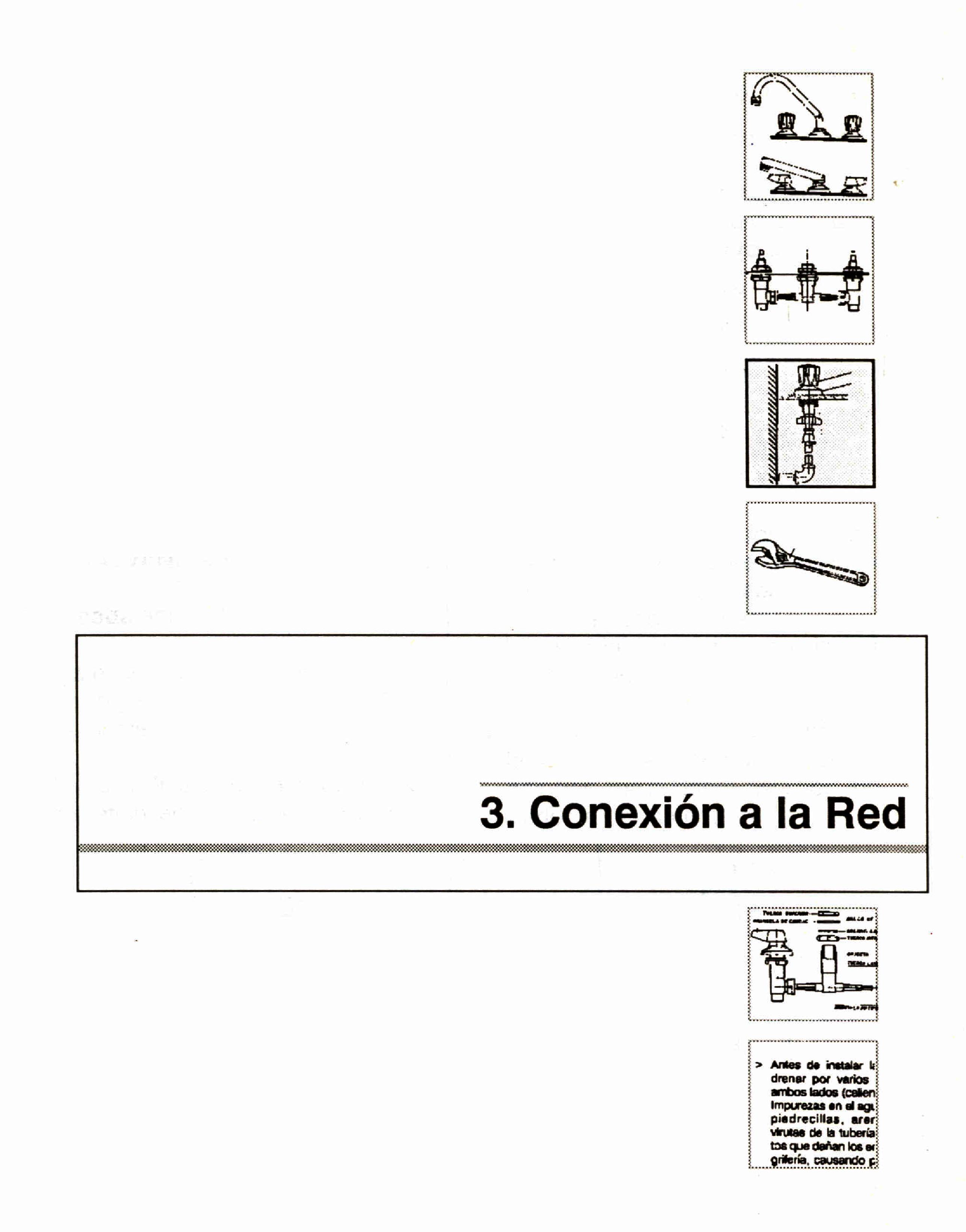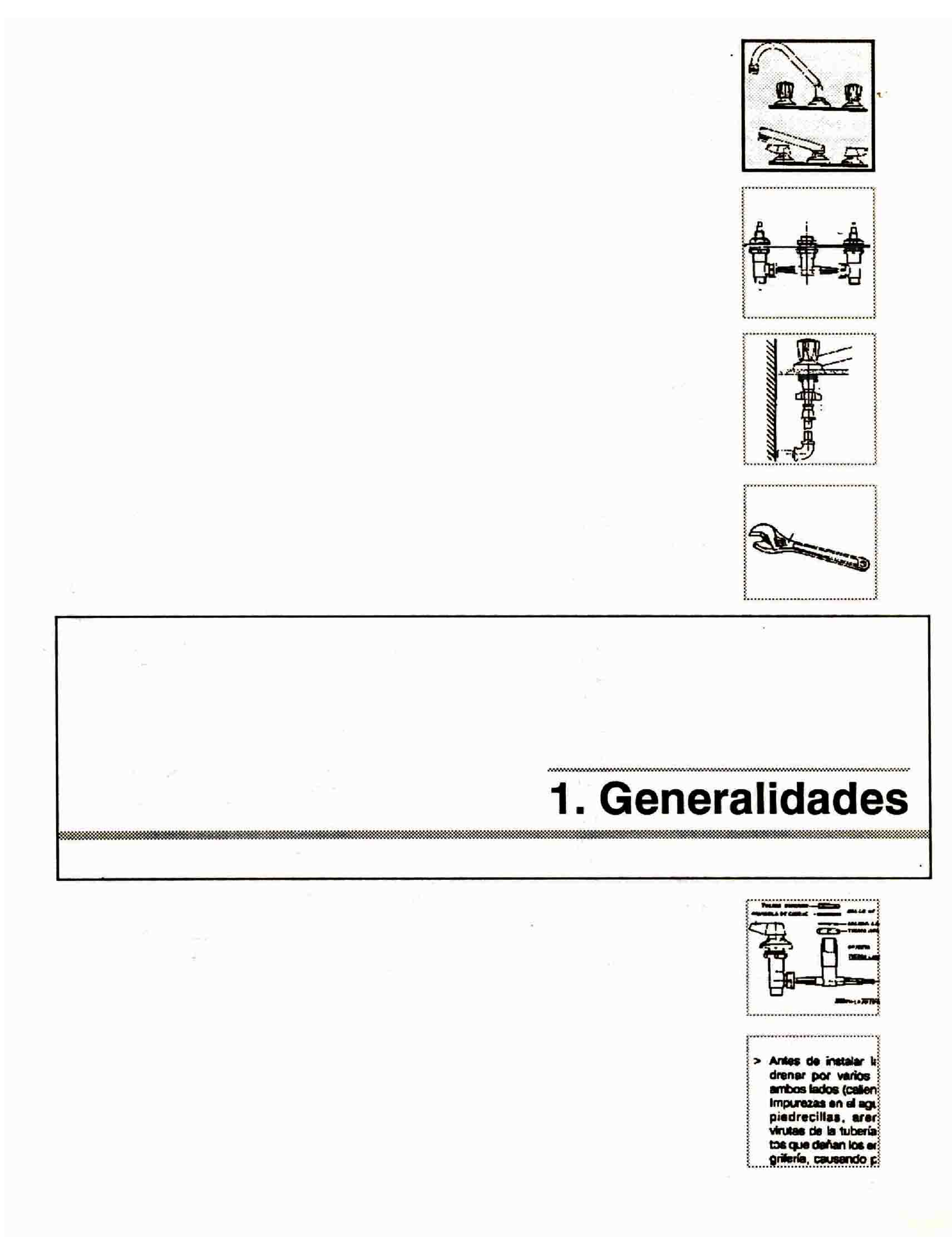 > Antes de instalar la grifería deje drenar por varios segundos en ambos lados (caliente y fría). Impurezas en el agua tales como, piedrecillas, arena, mortero, virutas de la tubería, son elementos que dañan los empaques de la grifería, causando posteriores escapes de agua. > Después de instalar el mezclador, retire el aireador y deje drenar nuevamente la tubería. > No use pegantes, sellantes, hilazas, ni grasas de origen animal o vegetal en las roscas. En la conexión de las acometidas utilice únicamente cinta de teflón. > No utilice llaves para tubo en las tuercas, algunas se ajustan solo manualmente, para el manejo de tuercas metálicas utilice llaves expansivas. > Para algunas tuercas se recomienda la utilización de llaves múltiples, especialmente diseñadas para su manejo, (ver cuadro herramientas).