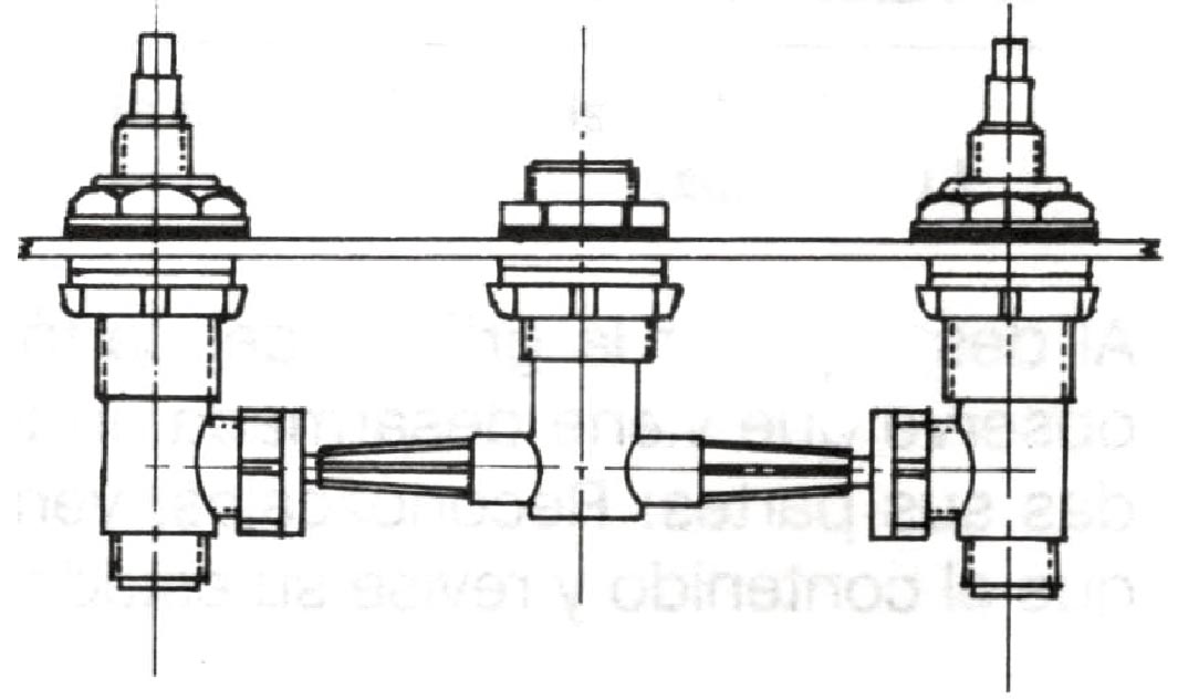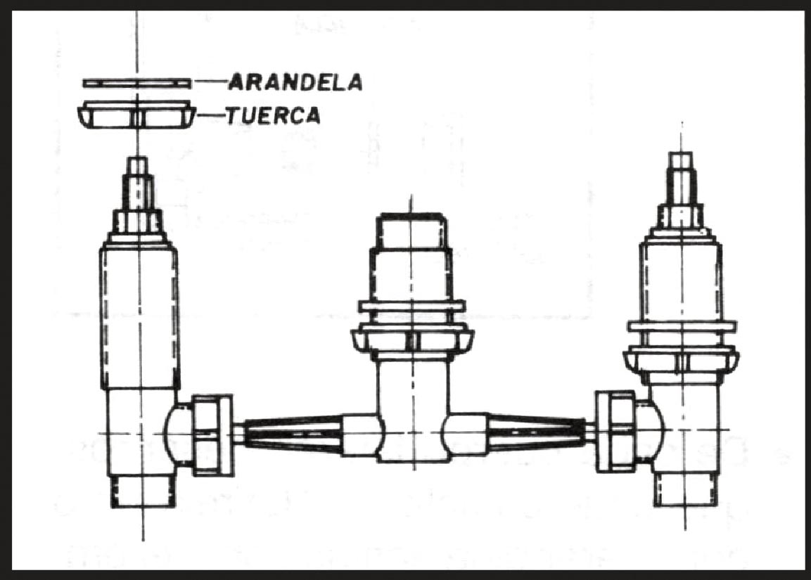 • En cada uno de los cuerpos laterales del mezclador y en el cuerpo central de la cruceta enrosque por la parte superior, una tuerca aseguradora hasta el fondo. Luego coloque sobre ellas una arandela antifricción.