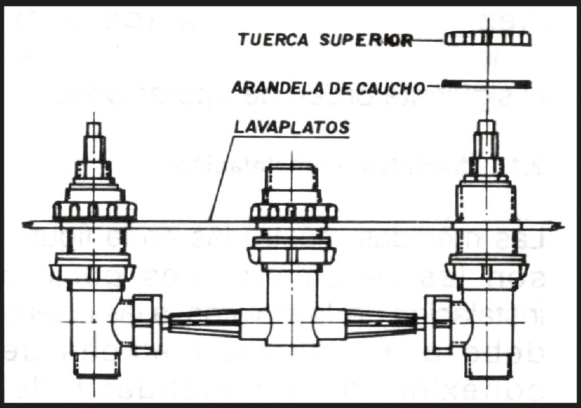 • En cada uno de los cuerpos laterales y el cuerpo central del mezclador que sobresalen por la parte superior del lavaplatos, inserte el empaque de caucho y enrosque la tuerca superior correspondiente, ajustándolas solamente hasta que el mezclador quede nivelado.