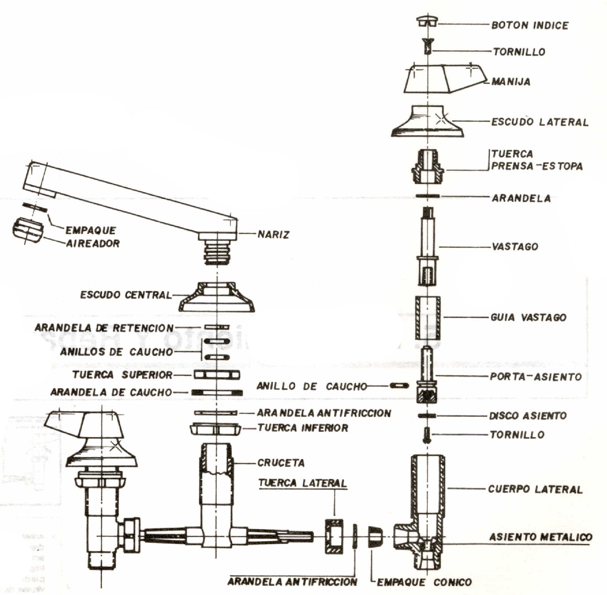 Introduzca en primer lugar el porta-asiento en la guía del vástago y luego enrosque el vástago. Observe que la guía del vástago, en la parte inferior externa tiene una pequeña huella, al introducir el conjunto en el cuerpo del mezclador, ésta debe encajar con una pequeña espiga que hay en la pared interior del cuerpo del mezclador en el fondo. Este pequeño ensamblaje impide que la guía del vástago, gire con éste, en el momento de ser accionado, provocando ruidos muy molestos. Inserte la arandela antifricción, enrosque la tuerca prensaestopas y continúe con el proceso de armado. Desenrosque las tuercas laterales y revise los empaques y arandelas antifricción. El deterioro de éstos empaques puede ocasionar escapes por esta área. Los posibles escapes por el cuerpo central de la cruceta, se deben a la ausencia o deterioro de los empaques. De la punta de la nariz, desenrosque manualmente el aireado, revíselo, si se encuentra obstruido, límpielo, esto le permitirá obtener un chorra de agua más agradable. Los repuestos y partes de este mezclador se encuentran disponibles en el mercado local.
