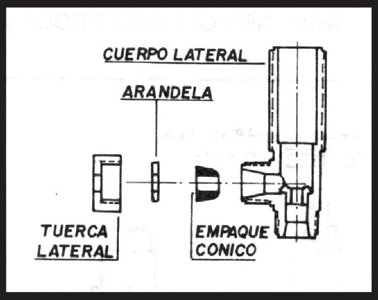 • De cada cuerpo lateral, desenros que la tuerca (lateral). Retírela junto con la arandela antifricción y el empaque cónico de caucho y luego insértelos en el mismo orden, en las puntas de la cruceta.