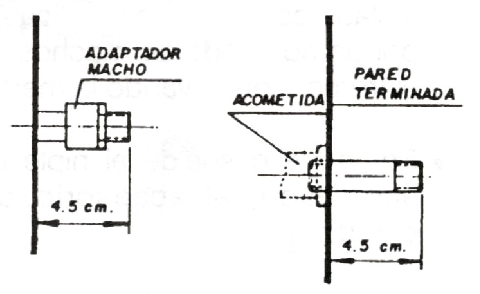 • Si los accesorios de acometida que están entre la pared, son de hierro galvanizado, corte y rosque niples, de una longitud tal, que después de instalados, sobresalgan 4.5 cms. de la pared terminada.