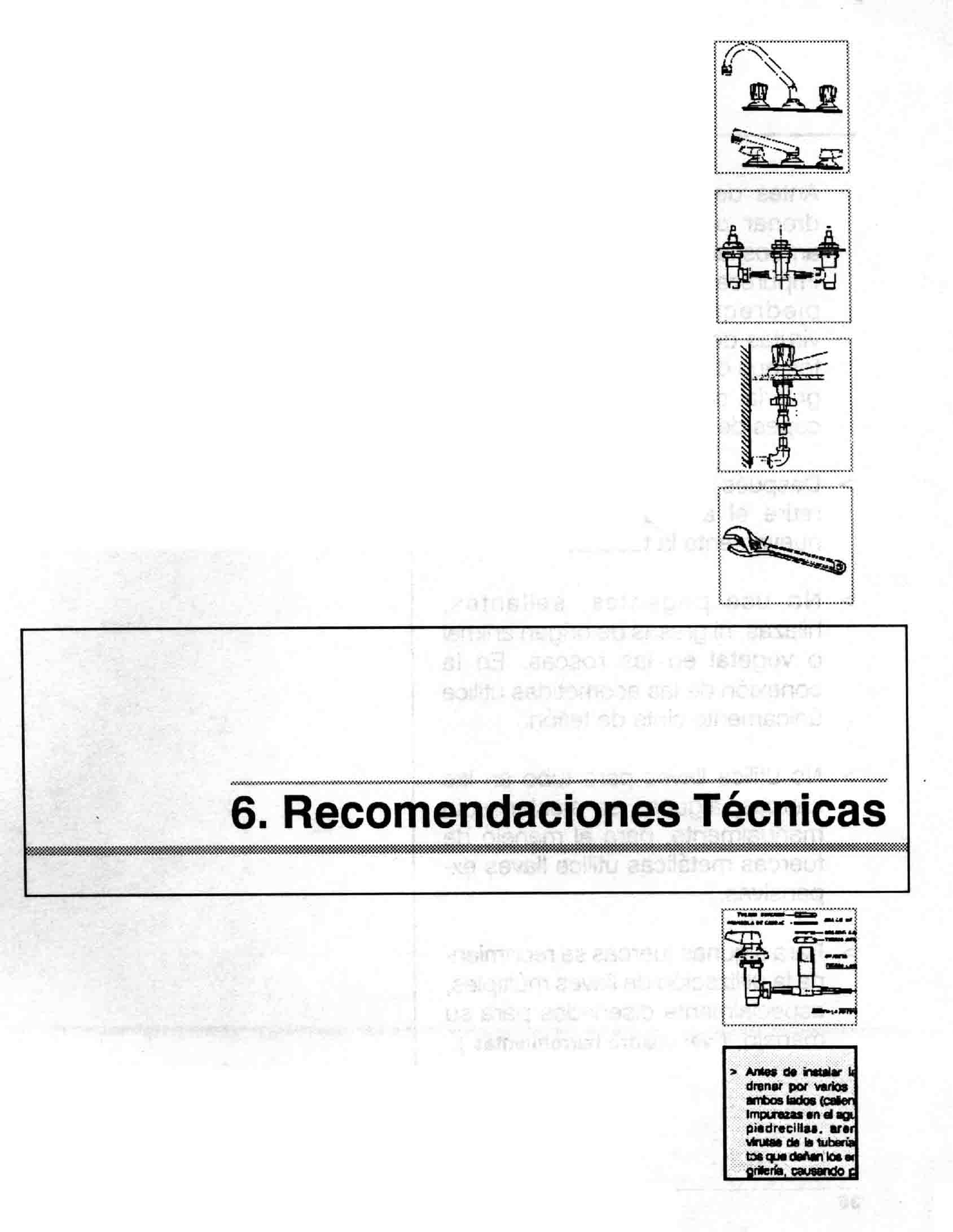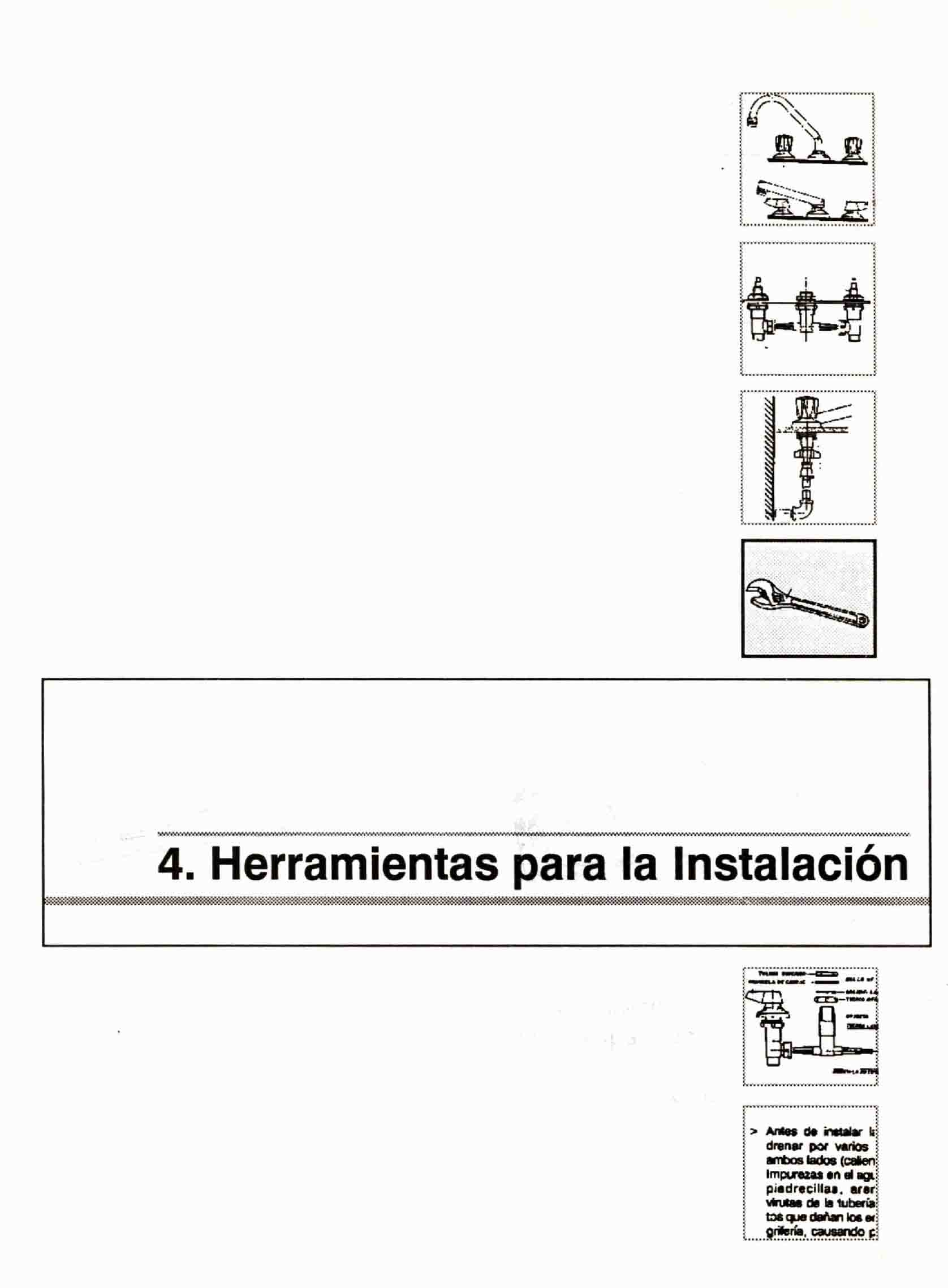 > Antes de instalar la grifería deje drenar por varios segundos en ambos lados (caliente y fría). Impurezas en el agua tales como, piedrecillas, arena, mortero, virutas de la tubería, son elementos que dañan los empaques de la grifería, causando posteriores escapes de agua. > Después de instalar el mezclador, retire el aireador y deje drenar nuevamente la tubería. > No use pegantes, sellantes, hilazas, ni grasas de origen animal o vegetal en las roscas. En la conexión de las acometidas utilice únicamente cinta de teflón. > No utilice llaves para tubo en las tuercas, algunas se ajustan solo manualmente, para el manejo de tuercas metálicas utilice llaves expansivas. > Para algunas tuercas se recomienda la utilización de llaves múltiples, especialmente diseñadas para su manejo, (ver cuadro herramientas).