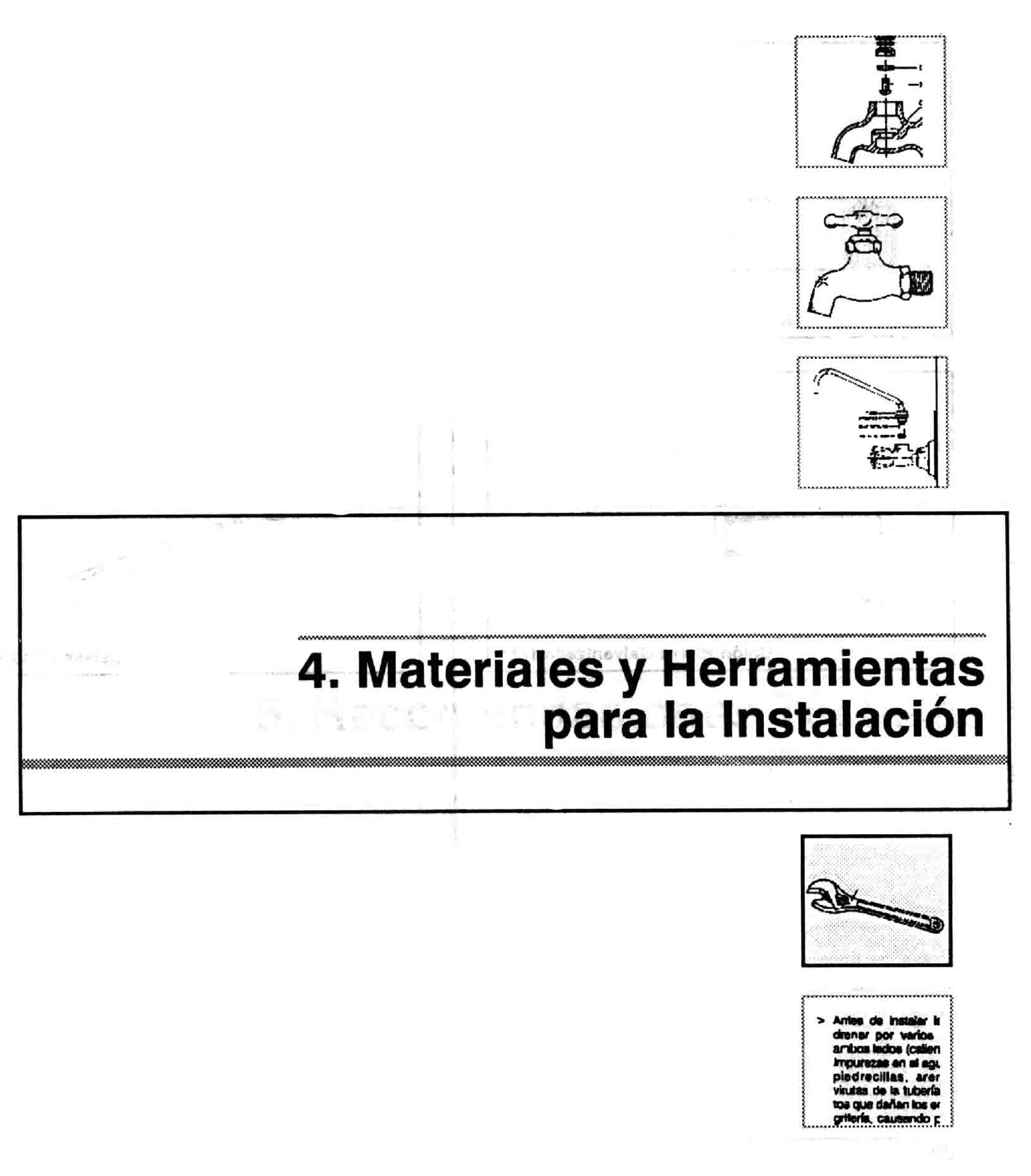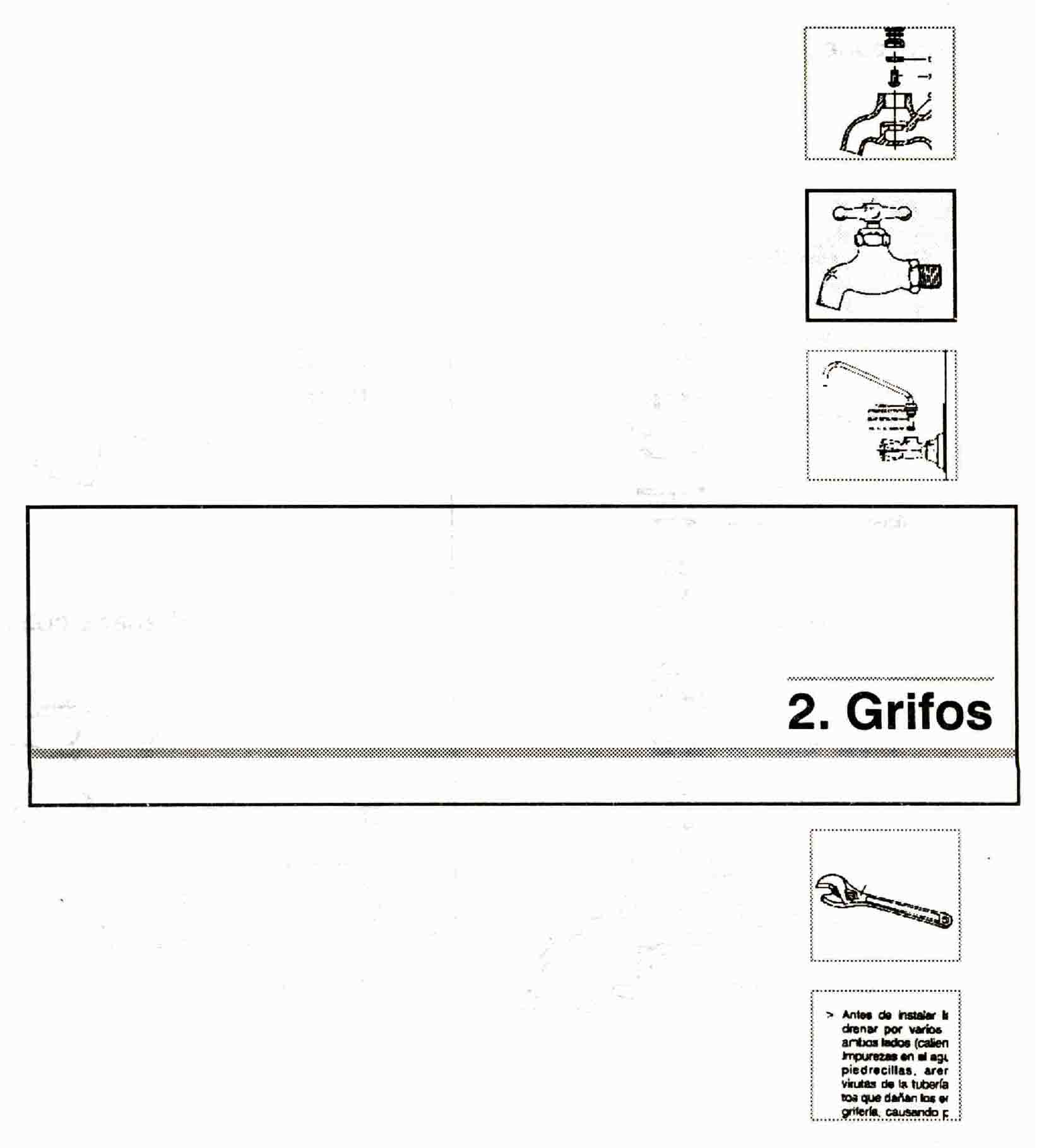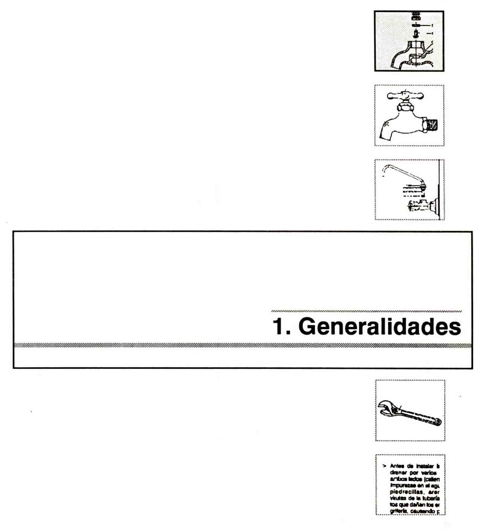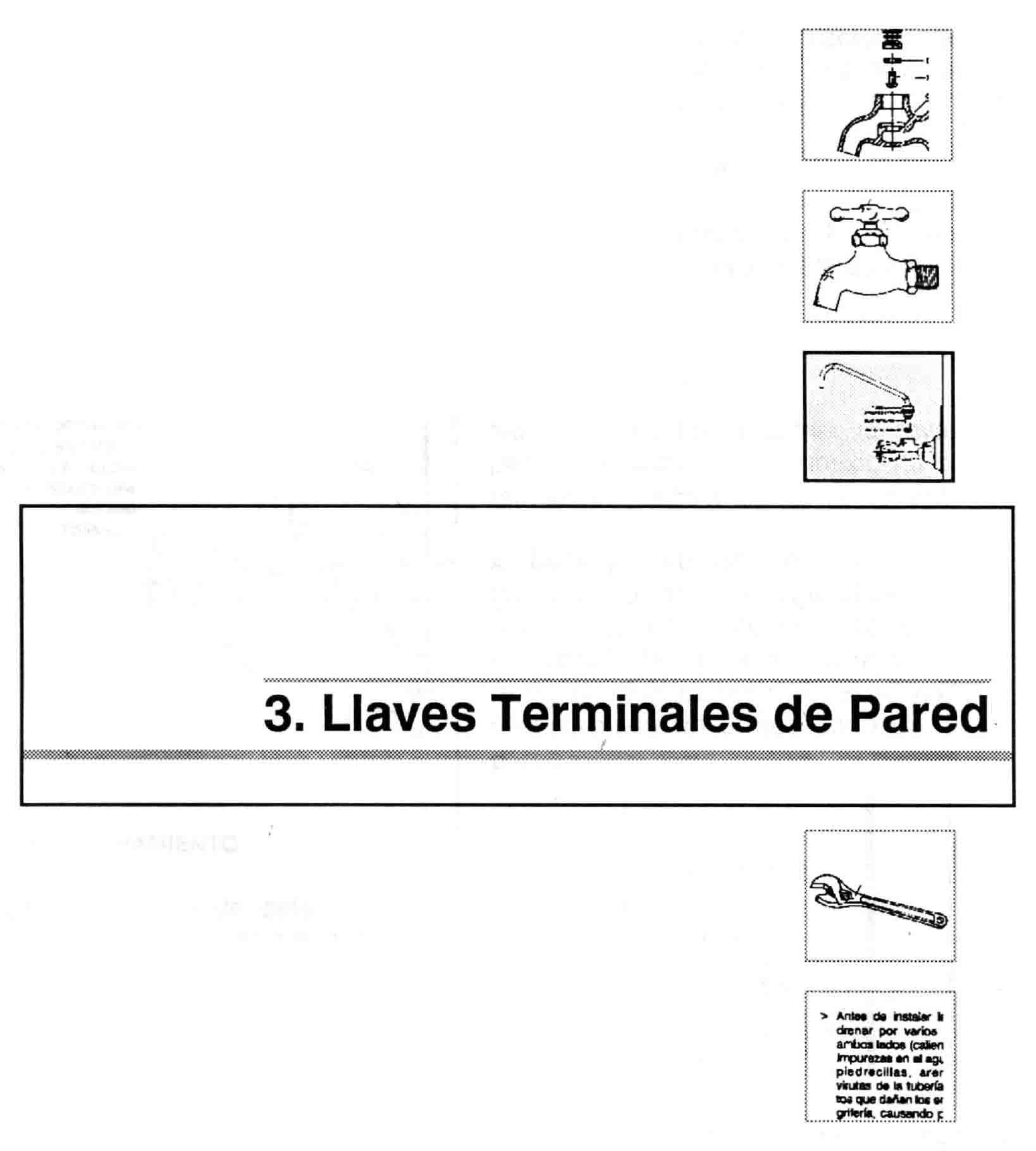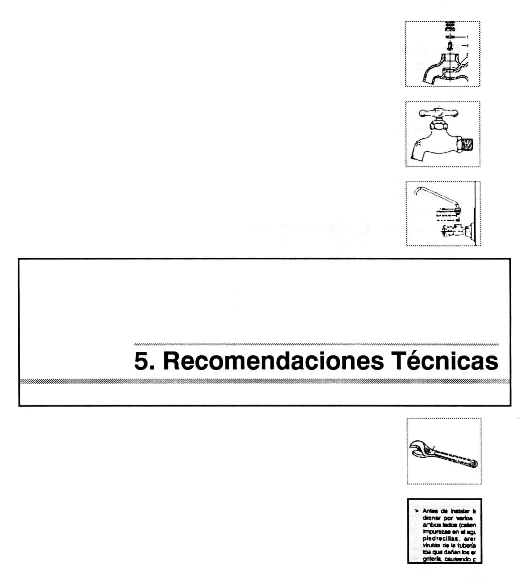 > No utilizar llaves de tubo en la instalación de las llaves terminales. > No utilizar hilazas, sellantes o grasa en las roscas, utilizar únicamente cinta de teflón. > Drenar la tubería antes de la instalación. Esto es, dejar escapar momentáneamente el agua, para evacuar cualquier residuo que haya podido quedar durante la instalación de la red.