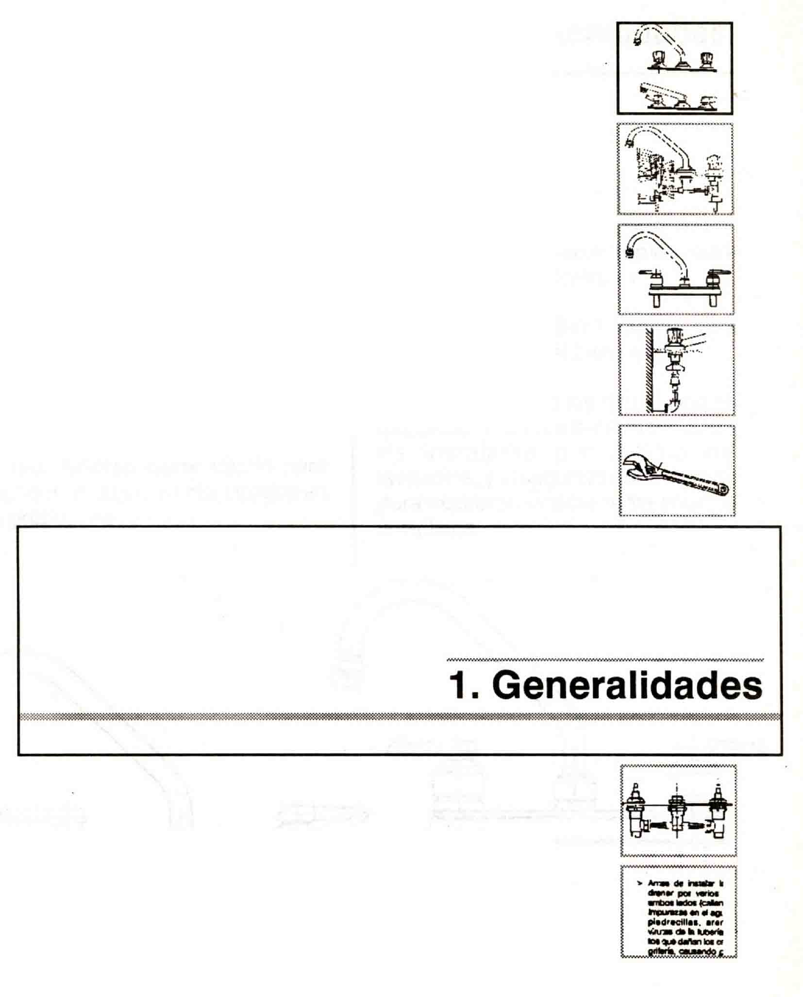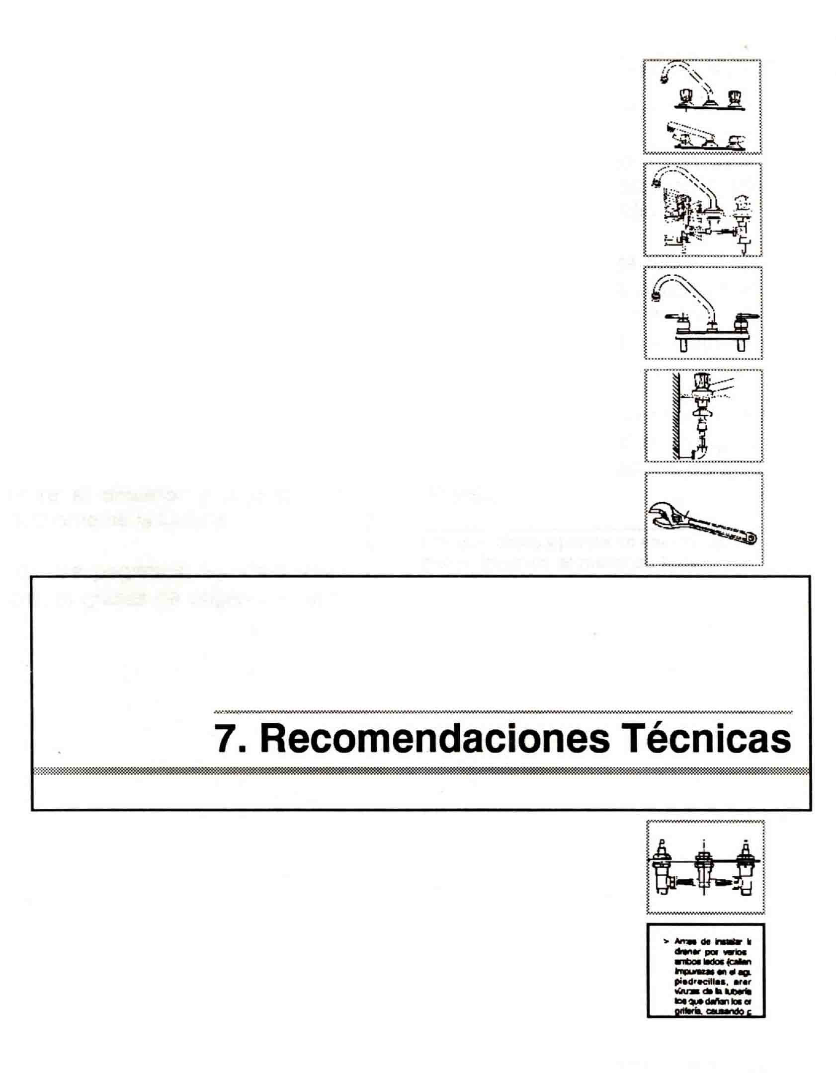 > Antes de instalar la grifería deje drenar por varios segundos en ambos lados (caliente y fría). Impurezas en el agua tales como, piedrecillas, arena, mortero, virutas de la tubería, que pueden haber quedado durante la instalación de la red, son elementos que dañan los empaques de la grifería, causando posteriores escapes de agua. > Después de instalar el mezclador, retire el aireado y deje drenar nuevamente la tubería. > No use pegantes, sellantes, hilazas, ni grasas de origen animal o vegetal en las roscas. En la conexión de las acometidas utilice únicamente cinta de teflón. > No utilice llaves para tubo en las tuercas, algunas se ajustan solo manualmente, para el manejo de tuercas metálicas utilice llaves expansivas. > Para algunas tuercas se recomienda la utilización de llaves múltiples, especialmente diseñadas para su manejo. Los repuestos y partes se encuentran disponibles en el mercado local.