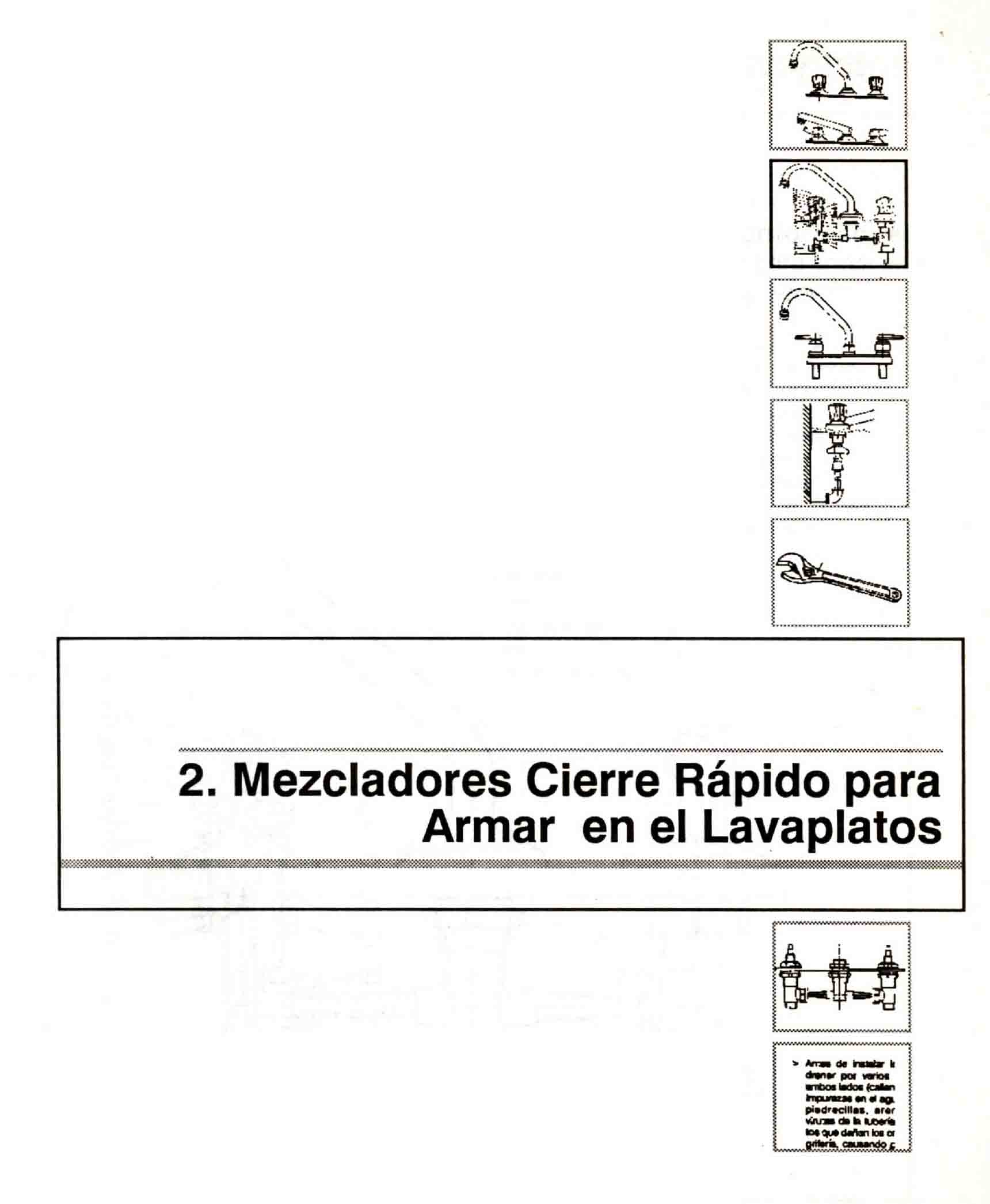 Con la punta de un lápiz, retire el empaque y el resorte del asiento interior del cuerpo del mezclador. Si el empaque o el escudo, se encuentran deteriorados, es conveniente reemplazarlos para evitar goteo. por la nariz del mezclador. El buje sirve de apoyo en la base del resorte. Desenrosque la tuerca escudo de la base de la nariz de salida, hale la nariz hacia arriba y revise los empaques de caucho, si estan deteriorados, reemplácelos para evitar escapes por el área de la base de la nariz. Después de la revisión, proceda a armar el conjunto, conservando el orden y posición de las partes. Inserte el conjunto de selle de tal forma que la pestaña penetre en la ranura del cuerpo. 6.2 PARA LOS MEZCLADORES C.R. DE ARMAR EN EL LAVAPLATOS El proceso de mantenimiento o reparación de esta clase de mezcladores, en su primera parte, se lleva a cabo siguiendo el orden operacional descrito para los anteriores, teniendo en cuenta que en éstos, los escudos, desempeñan el oficio de la cubierta cromada de los mezcladores de sobreponer.