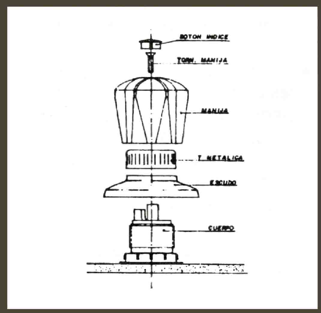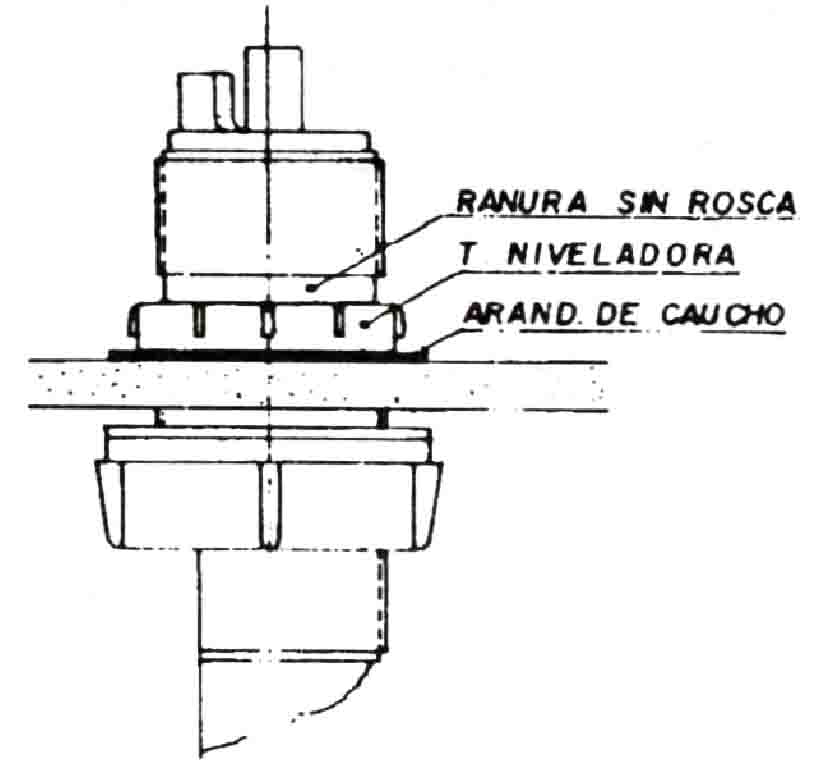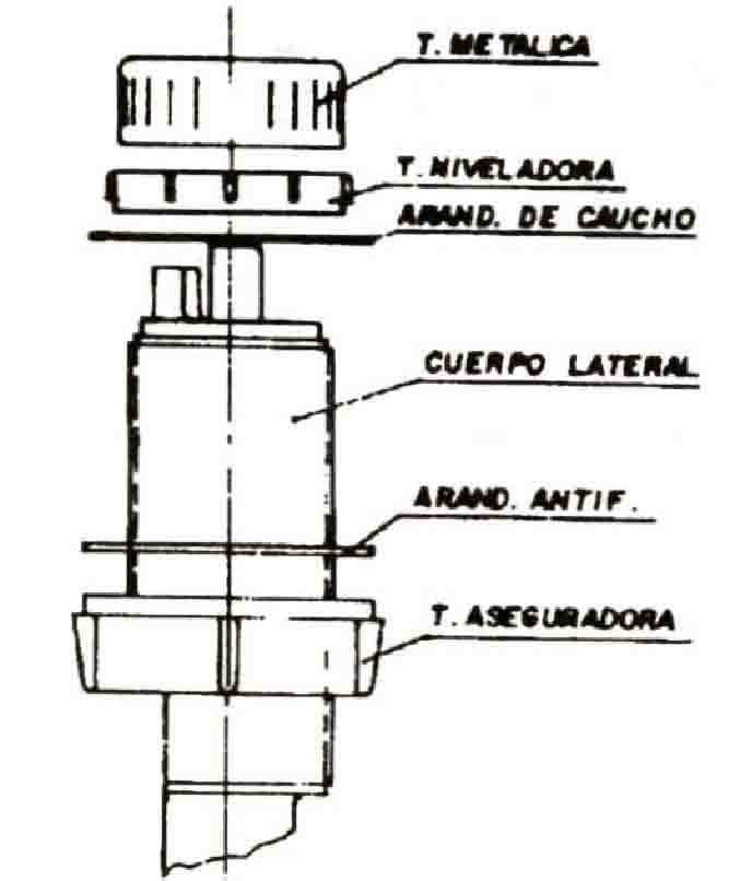 • De cada cuerpo lateral desenrosque la tuerca metálica (superior) y la tuerca niveladora y retire el empaque plano de caucho. Luego, enrosque las tuercas aseguradoras en los cuerpos laterales y en el central hasta el fondo y coloque sobre ellas las arandelas antifricción. Evite dejar caer el conjunto del vástago, en este paso.