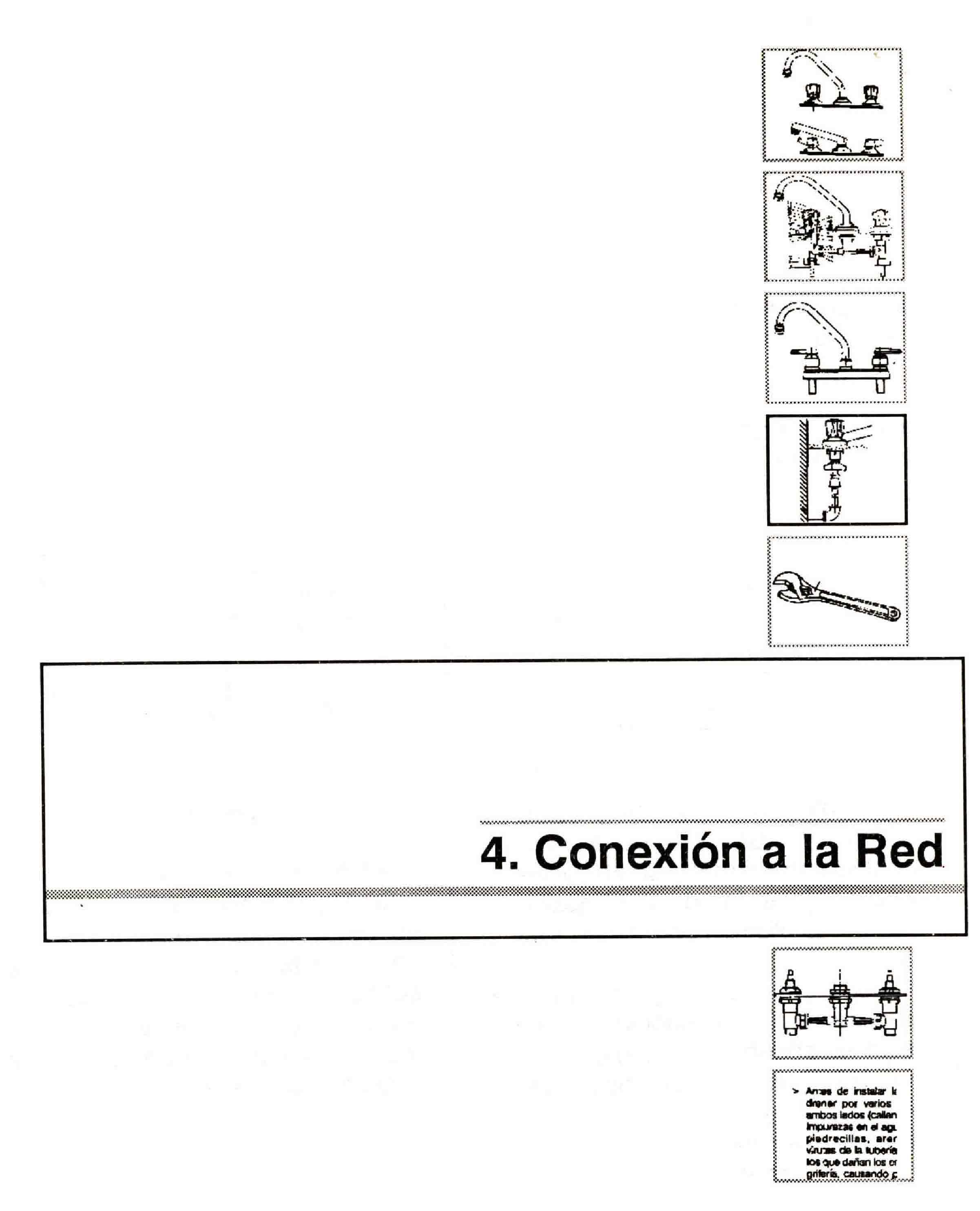 4. CONEXION A LA RED 4.1 Medidas de Instalación 4.2 Conexión a la Red A. Con Niples de Hierro Galvanizado B. Con Niples de PVC y CPVC C. Con Acoples Flexibles Metálicos D. Con Válvulas de Regulación 5. HERRAMIENTAS PARA LA INSTALACION 6. MANTENIMIENTO Y REPARACION 7. RECOMENDACIONES TECNICAS