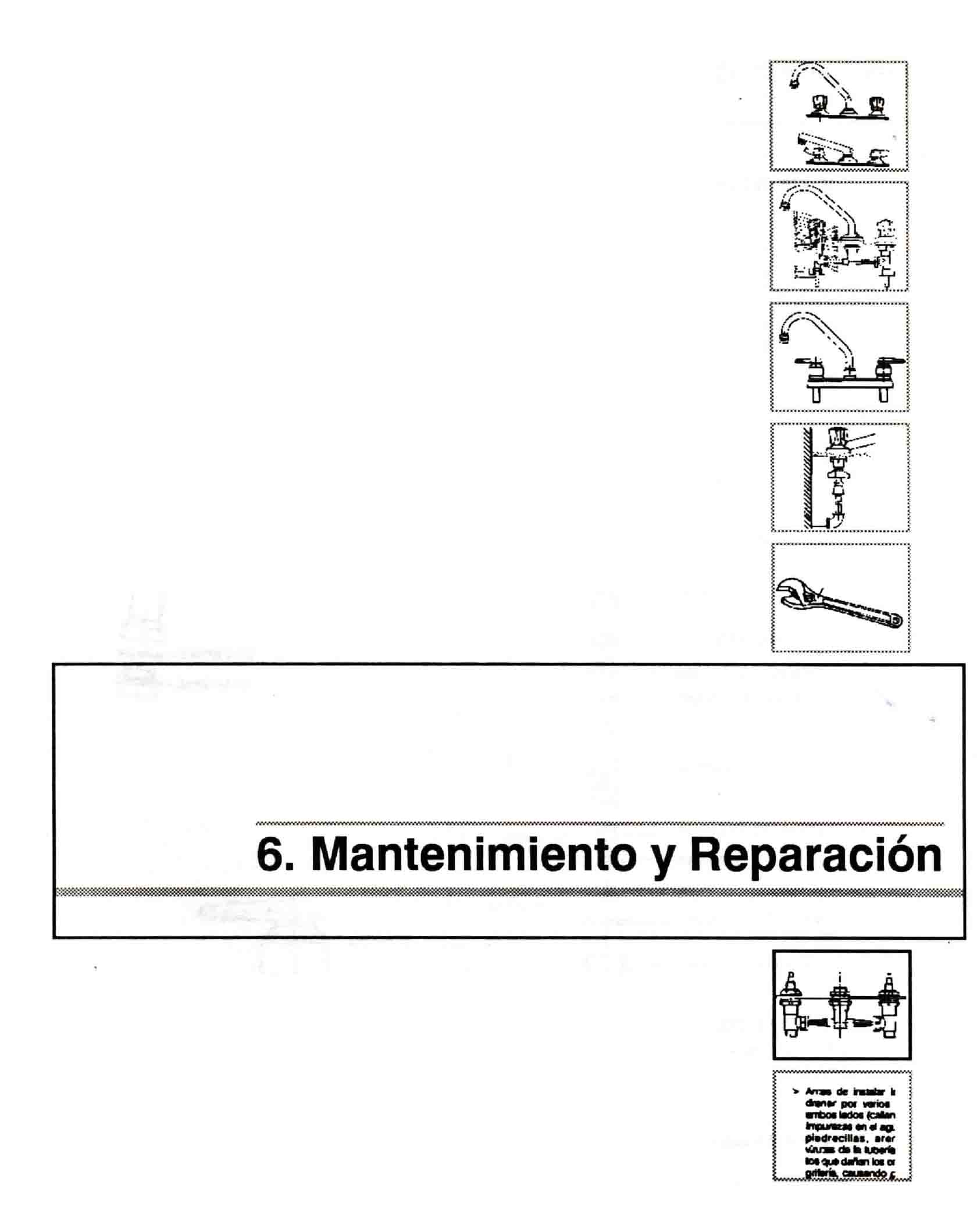 6.1 PARA LOS MEZCLADORES C.R. DE SOBREPONER EN EL LAVAPLATOS La siguiente información, se adjunta, como una guía de mantenimiento, en caso de fallas que puedan presentarse debido al mal manejo o al deterioro normal de algunas de las partes. Para ello, no necesita desacoplar totalmente el mezclador del lavaplatos.