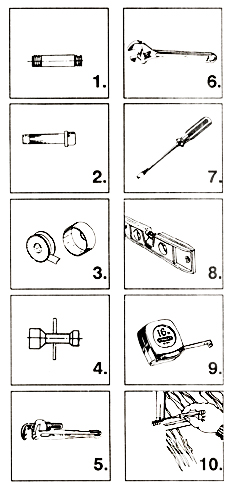 1. Niple de h.g. de 1/2" de diámetro, de 8 a 12 centímetros de longitud. 2. Niple de h. g. de 1/2" de diámetro, de 6 centímetros de longitud con tapón hembra roscado en uno de sus extremos. 3. Cinta de teflón. 4. Llave de copas 5. Llaves para tubos 6. Llaves expansivas 7. Destornillador de pala 8. Nivel de burbuja 9. Flexómetro 10. Lápiz |