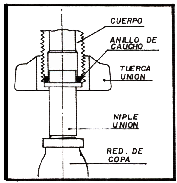 • Tome el niple unión, aplíquele cinta de teflón en la rosca, insértele la tuerca unión y enrósquelo en la reducción de copa, primero manualmente y termine de ajustarlo utilizando un hombre solo o una llave para tubos número 6.