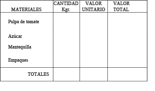 PROCESOS La Pasta de Tomate de Árbol (bocadillo) será entregado listo al consumidor Tecnología a usar: Entre más sencilla y clara sea la tecnología a usar, el producto final que obtendremos será de mayor aceptación. Medir material prima: La materia prima y los ingredientes a usar deben ser de muy buena calidad, color definidos' y verificar el estado de conservación de la pulpa que vamos a emplear. La fórmula a utilizar en este proceso será la siguiente: Pulpa de tomate de árbol 1 Taza Azúcar 1/4 tazas Grasa o Margarina 1 Cucharadita