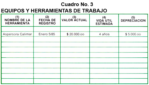 Aclaraciones: (1) Se anota el nombre(s) con que la herramienta se conoce en la región. (2) Fecha en la cual se empieza a utilizar la herramienta. (3) Valor que tiene la herramienta en el momento de registrarla. (4) Vida útil estimada del equipo o herramienta. (5) El resultado de dividir el precio de la herramienta por el número de años de vida útil. En este cuadro se registró el ejemplo de la aspersora visto anteriormente.