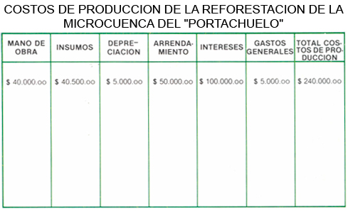 En la reforestación de la microcuenca "El Portachuelo" se emplearon 100 obreros a razón de $ 400.00 cada uno, igual a $ 40.000.00, insumos $ 40.500.00, depreciación de equipos $ 5.000.00, arrendamiento por 10 años (tiempo necesario para que se desarrollen las plantas) $50.000.00 intereses $100.000.00, transporte $5.000.00. Nuestro cuadro de costos de producción para la reforestación de esa microcuenca quedaría así: