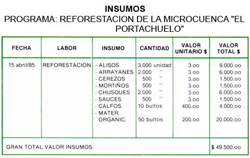 EJEMPLO: Para reforestar la microcuenca de "el portachuelo" ubicada en la vereda del Portachuelo, municipio de Santa Rosa de Viterbo, Departamento de Boyacá, se utilizaron: 3000 alisos, 2000 arrayanes, 500 cerezos, 500 mortiños, 2000 chusques y 500 sauces. Además 10 bultos de cal tos y 50 bultos de abono orgánico. El valor unitario por árbol es de $3.00, bultos de cal tos $400.00 y bulto de materia orgánica $ 200.00. Este material se adquirió el15 de abril de 1985, nuestro cuadro quedaría así: