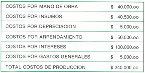 Mano de obra: Se refiere al valor total de los jornales utilizados para obtener una producción. Insumos: Es el valor total de los insumos utilizados en las labores de producción. Depreciación: Es la suma de la depreciación de todos los instrumentos utilizados para una producción determinadas. Arrendamiento: Es el pago que se hace al dueño de la tierra por prestarla para producir en ella. Intereses: Es el valor total que se paga por el capital que necesitamos para trabajar.