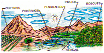 • Grado de pendiente. • Pantanos. • Cultivos. • Pastos. • Bosques. |