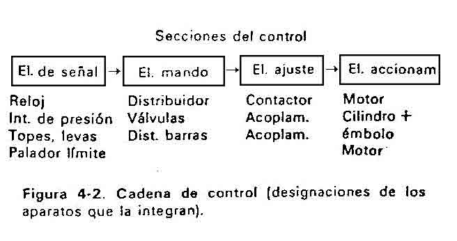 | GENERALIDADES Se entiende por automatización la regulación, y control automáticos de máquinas e instalaciones. Los fines de la automatización son: mayor precisión de trabajo y seguridad de funcionamiento, y acortamiento de los tiempos de fabricación respecto de las máquinas controladas manualmente. Los ciclos de trabajo se controlan y regulan mediante dispositivos especiales de las máquinas. Control Se habla de control o mando, cuando mediante un impulso se comienza, concluye o influye de cualquier otro modo en un ciclo de trabajo. En el caso de un control de horario el generador de impulsos es por ejemplo un reloj. Por medio de un distribuidor puede aprovecharse este impulso para realizar procesos de conmutación en puntos diferentes de la instalación. En la figura 4-1 se expone como ejemplo el accionamiento de un interruptor que conecta un motor eléctrico. Los componentes de un sistema de control dispuestos en serie reciben el nombre de cadena de control o bucle abierto. Descripción general de los componentes de una cadena de control según la norma DIN 19 226: Elementos de señal que entregan señales o bien impulsos cuando se dan magnitudes físicas determinadas (tiempo, temperatura, fuerza, magnitud de medición, alteración de forma y otras). Elementos de control que enlazan diferentes señales o pasa una señal a diferentes elementos de ajuste según leyes determinadas. |